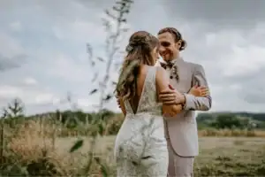 Ein Paar lächelt sich auf einer sonnenbeschienenen Wiese sanft zu – Reportage der Hochzeitsfotografin Köln. Ein Paar lächelt sich auf einer sonnenbeschienenen Wiese sanft zu – Reportage der Hochzeitsfotografin Köln.