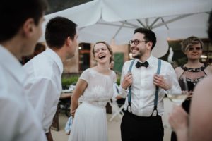 Das Brautpaar lacht entspannt mit Gästen im Garten bei ihrer Hochzeitsreportage NRW. Das Brautpaar lacht entspannt mit Gästen im Garten bei ihrer Hochzeitsreportage NRW.