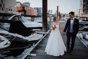 Brautpaar lächelt Händchen haltend am Hafen Köln nahe Schokoladenmuseum – Hochzeitsreportage NRW. Brautpaar lächelt Händchen haltend am Hafen Köln nahe Schokoladenmuseum – Hochzeitsreportage NRW.