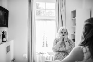 Die Braut lächelt mit den Händen vor dem Mund, gefangen in einem freudigen Moment bei ihrer standesamtlichen Trauung in Köln.