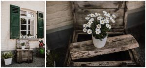 Ein weißer Topf mit Gänseblümchen auf einer rustikalen Truhe vor grünen Fensterläden – natürliche Hochzeitsfotografie Bonn. Ein weißer Topf mit Gänseblümchen auf einer rustikalen Truhe vor grünen Fensterläden – natürliche Hochzeitsfotografie Bonn.