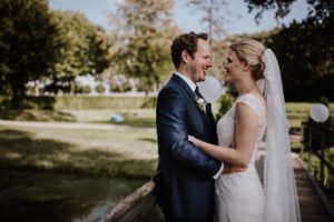 Braut und Bräutigam lächeln sich auf einer Holzbrücke im Park an – Hochzeitsreportage NRW. Braut und Bräutigam lächeln sich auf einer Holzbrücke im Park an – Hochzeitsreportage NRW.