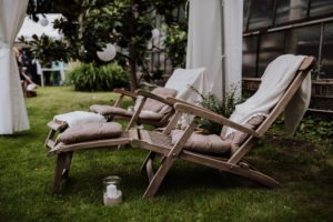 Zwei gemütliche Holzstühle mit Decken stehen im Garten – für entspannte Hochzeitsmomente in Köln. Zwei gemütliche Holzstühle mit Decken stehen im Garten – für entspannte Hochzeitsmomente in Köln.