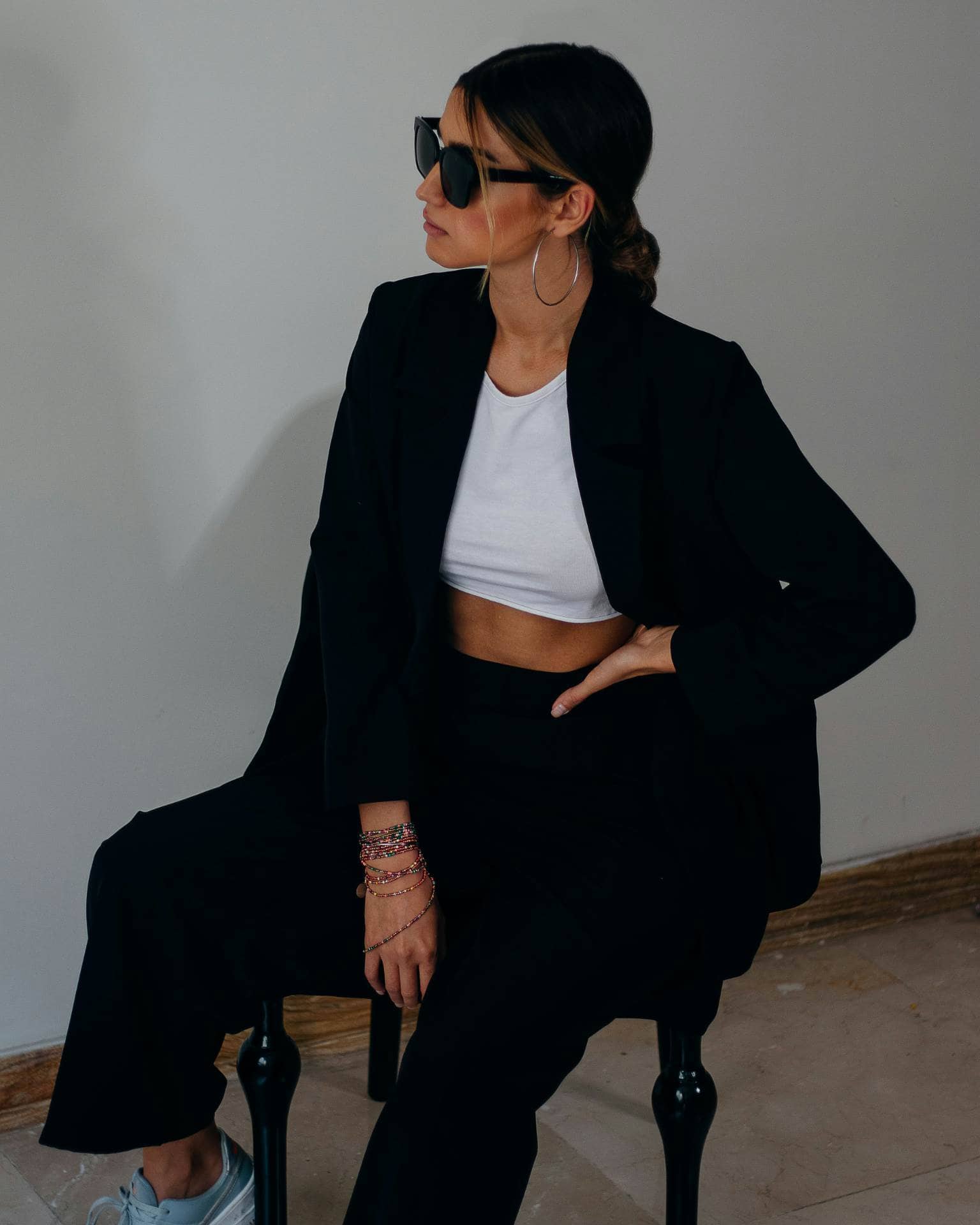 Braut im schwarzen Anzug und Sonnenbrille entspannt vor der standesamtlichen Trauung in Köln. Braut im schwarzen Anzug und Sonnenbrille entspannt vor der standesamtlichen Trauung in Köln.