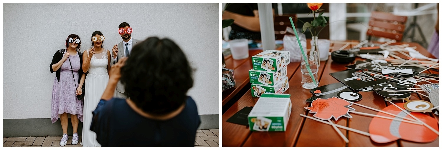 Freunde lachen mit Masken-Requisiten bei einer Hochzeit, offen eingefangen von einer Hochzeitsfotografin Köln. Freunde lachen mit Masken-Requisiten bei einer Hochzeit, offen eingefangen von einer Hochzeitsfotografin Köln.