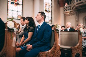 Hochzeitsgäste sitzen in einer Kölner Kirche, umgeben von Blumen und Licht bei der Trauung. Hochzeitsgäste sitzen in einer Kölner Kirche, umgeben von Blumen und Licht bei der Trauung.