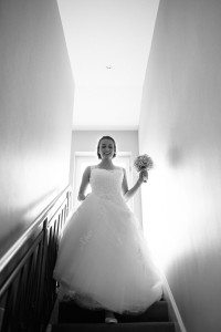Braut mit Blumenstrauß lächelt beim Heruntergehen der Treppe – Hochzeitsreportage Köln. Braut mit Blumenstrauß lächelt beim Heruntergehen der Treppe – Hochzeitsreportage Köln.